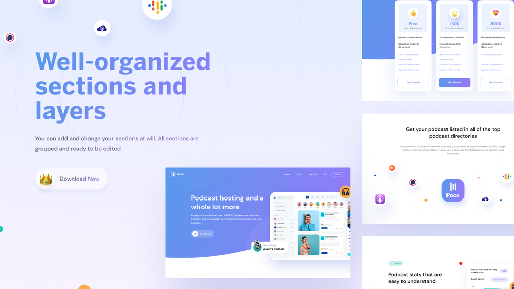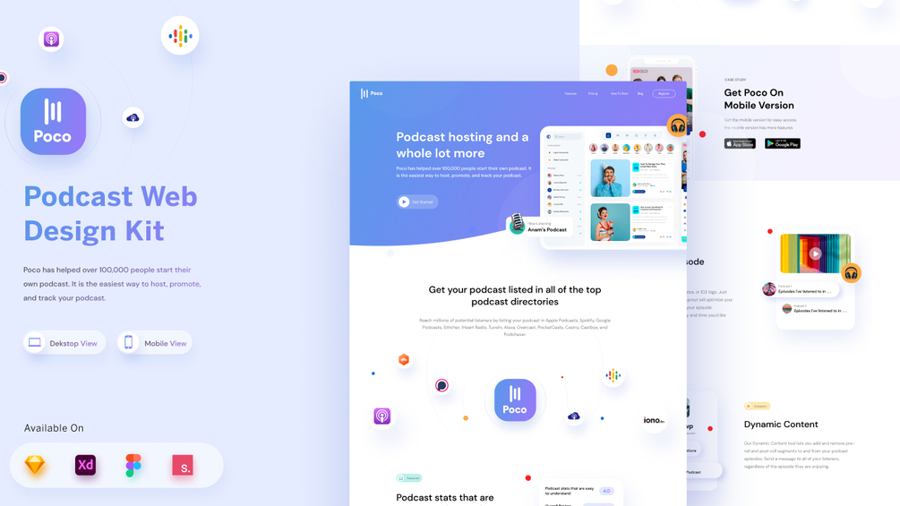 Podcast - Web Design KIT. Perfect, fresh, and stylish UI Kit for building beautiful Landing Pages. Include Features, Pricing, How to start, Blog, Profile, Explore Podcast.